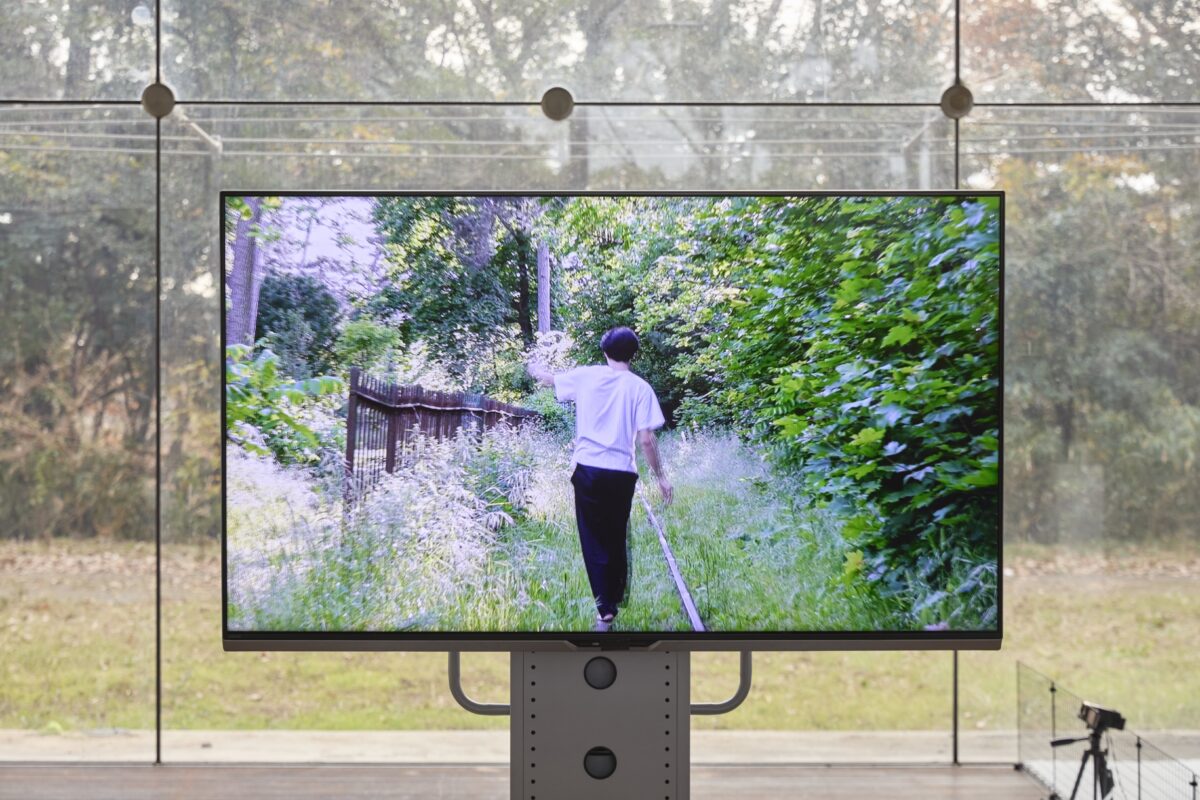 As anthropologist Tim Ingold suggests, since modernization, people may no longer “move” by their own agency but are rather “transported.” Perhaps we are drawn to the forest because, deep down, we long for the chance to wander and get lost. In response, Yamaguchi performed a piece where they walked along a railroad track they happened to find in the forest. The work captures the contrast between the direct, unyielding path of the rails—which don’t permit deviation—and the forest, which invites wandering and instability. This tension is recorded as a video progressing in a single direction.